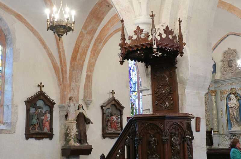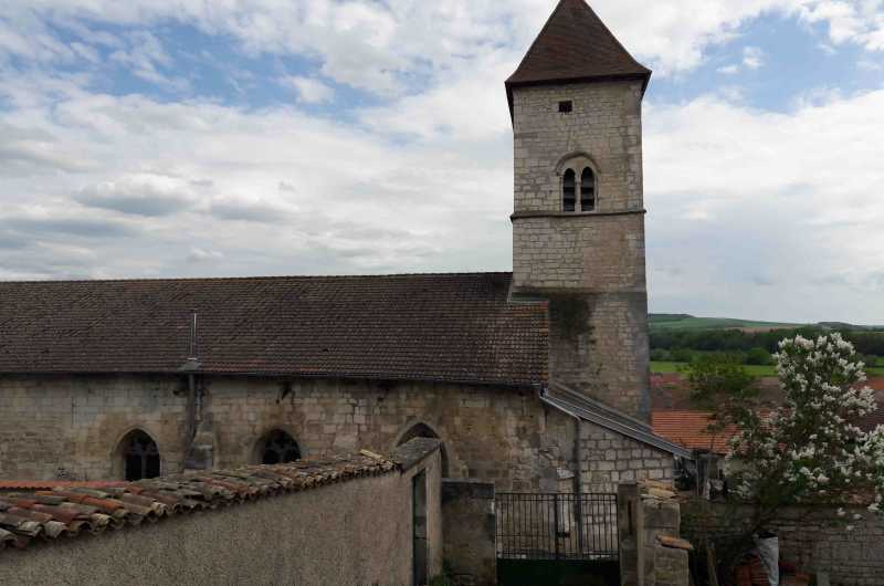 Remarquez avant d’entrer le portail gothique surmonté d’une frise feuillagée et d’un tympan de forme originale en ac-colade. Le mobilier comprend une Vierge de pitié en calcaire polychrome XVe -XVIe et un gisant XVIe . Les vitraux sont signés Benoît frères (1936-1969 atelier installé à Nancy).