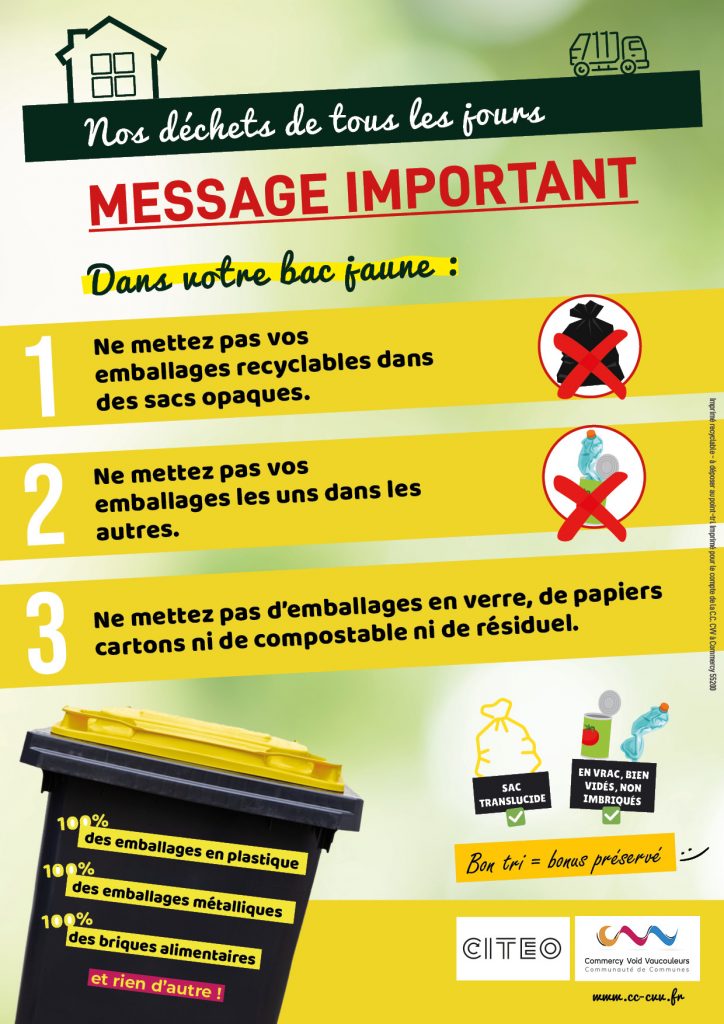 La collecte des ordures ménagères, bacs jaunes et sacs noirs, se fait le lundi matin toutes les deux semaines.